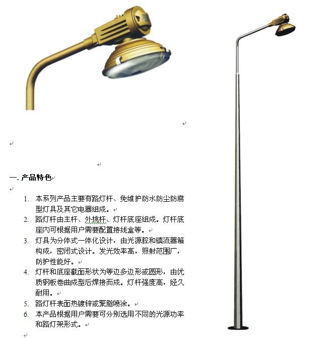 路桿燈型號 配套燈具型號 光源功率(W) 建議安裝高度 SBR6120-QL65R05 X-SBF6106-YQL65 65 5~6 SBR6120-QL65R06 X-SBF6106-YQL65 2X65 5~6 SBR6120-QL120R05 X-SBF6106-YQL120 120 6~10 SBR6120-QL120R06 X-SBF6106-YQL120 2X120 6~10 SBR6120-QL150R05 X-SBF6106-YQL150 150 8~12 SBR6120-QL150R06 X-SBF6106-YQL150 2X150 8~12