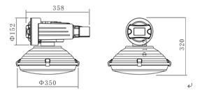 燈具外形及尺寸:規格型號 額定功率(W) 工作電流(A) 光源光通量(lm) 有效光通量(Plm) 建議安裝高度