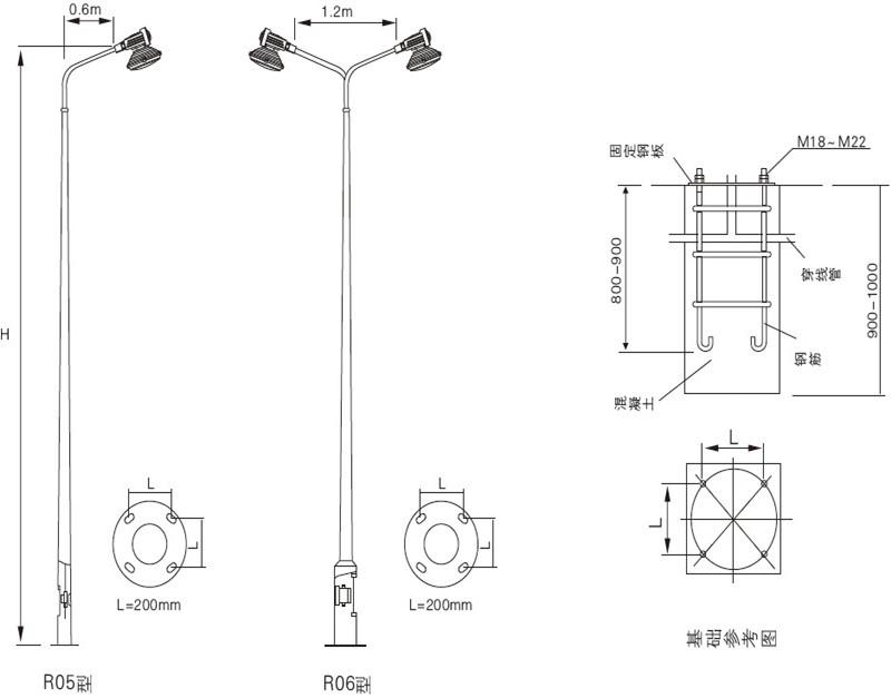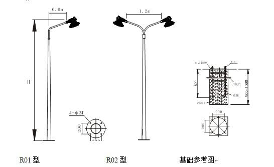 注:本路燈基礎圖適用于地基承載設計值f≥60kpa和最大風力不超過11級,在山區及f<60kpa的弱軟地基的地區,地質情況比較復雜時,應由當地勘察設計單位確定。本圖僅作參考。